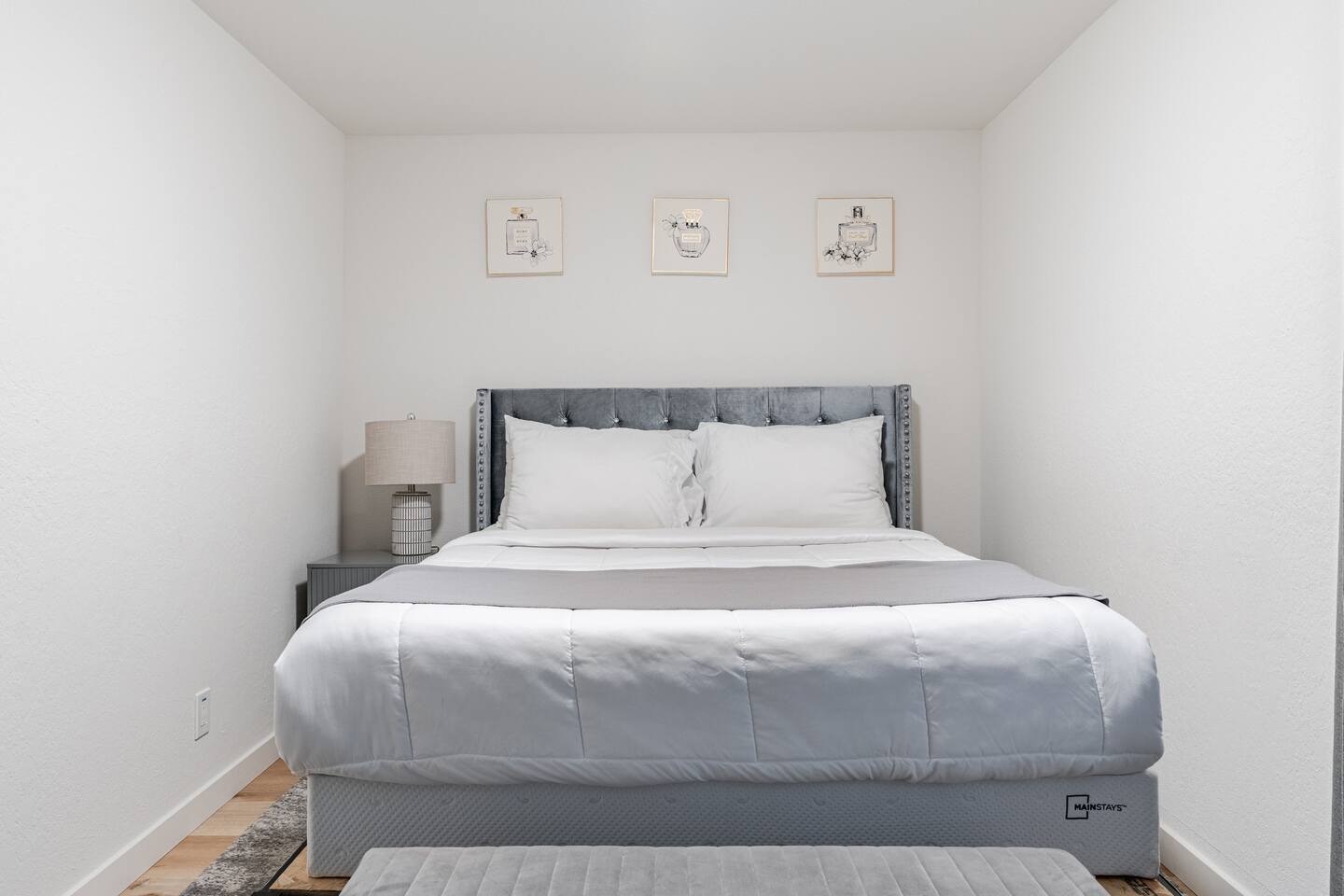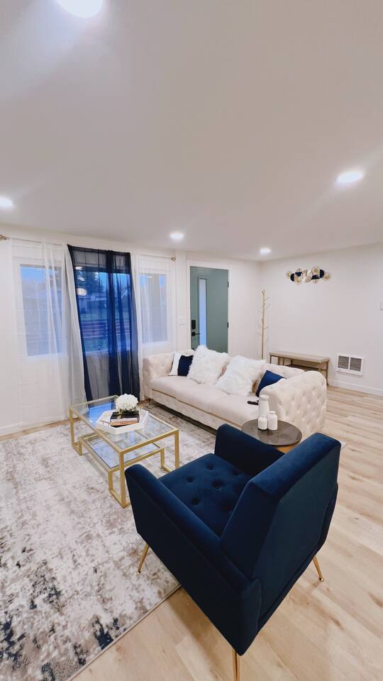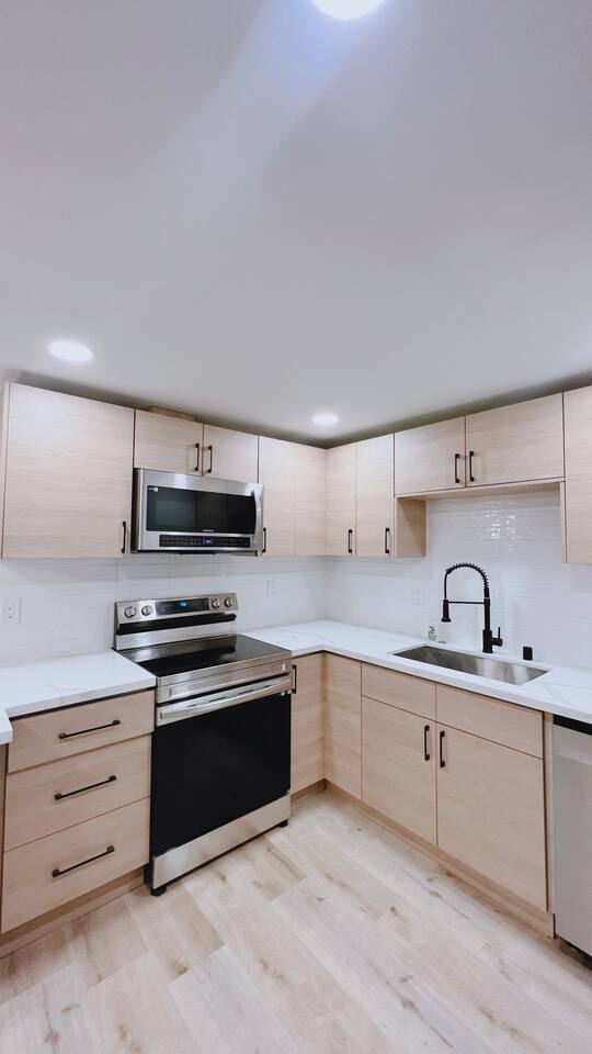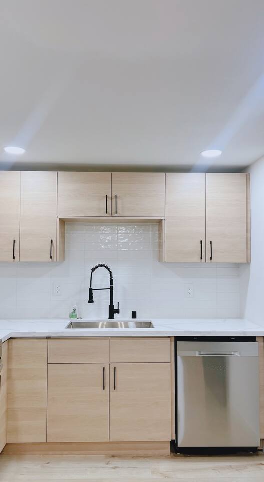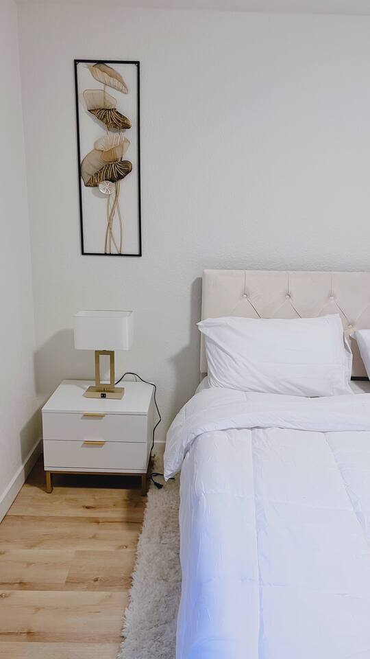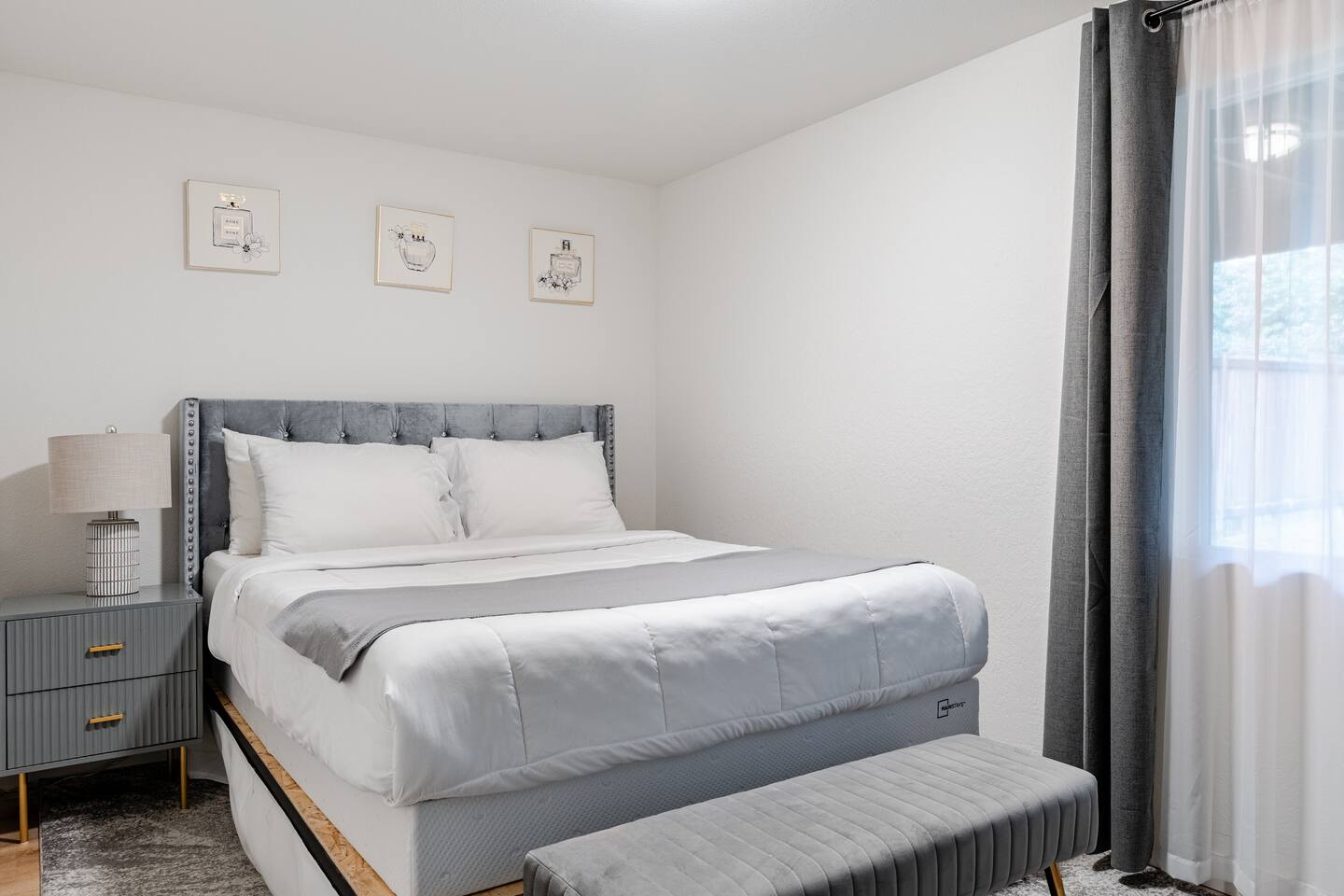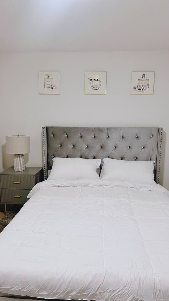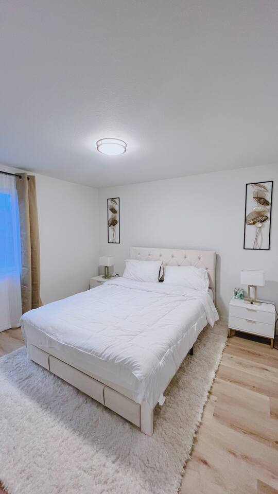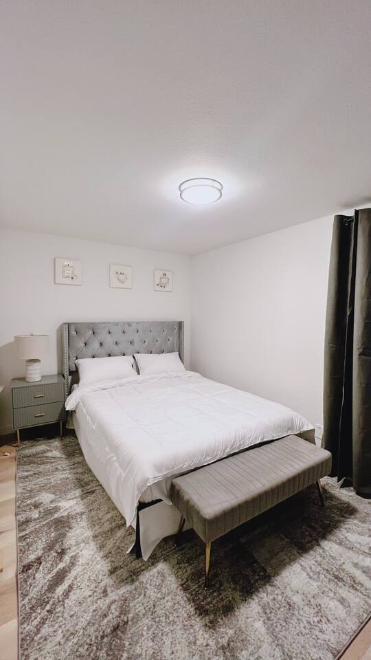 This house is perfect for couples travelling together, a family, traveling business or health care professionals wanting to have their own space. We are equipped with high-speed fiber optic internet for a seamless work from home experience. • Living room: This area includes a comfortable sofa, side chair, Roku smart TV (complimentary Netflix), board games. ✔ Comfortable sofa ✔ Roku smart TV (complimentary Netflix) ✔ Comfy side chair ✔ Coffee tables ✔ Board games ✔ Air purifier • Kitchen: Newly remodeled kitchen has a large quartz counter with stools and dining table that would fit 4 people comfortably. ✔ Microwave / Stove / Oven ✔ Refrigerator / Freezer ✔ Dishwasher ✔ Coffee machine / French press ✔ Toaster ✔ Kettle ✔ Coffee, tea, creamer & sugar ✔ Silverware ✔ Pots & Pans ✔ Basic spices ✔ First Aid kits Perishable items such as cheese, butter, ketchup, etc. are not provided. • Bedroom: You'll feel like you're sleeping on a cloud in both queen memory foam mattress. Both bedroom windows have blackout curtains. ✔ Queen-Size Beds with Pillows, Linens and Sheets ✔ Closets with Hangers and Shelves ✔ Nightstands with Reading Lamps and USB ports ✔ Blackout curtains ✔ Iron and ironing board • Bathroom: Newly remodeled bathroom, quartz sink. ✔ Essential Toiletries ✔ Shower gel and shampoo ✔ Hair Dryer ✔ Feminine products ✔ Extra toothbrushes and razor • Laundry: a laundry room with washer and dryer in the home ✔ Laundry detergent ✔ Dryer sheets • Heating: The home is equipped with electric wall heaters with smart thermostats. • Outdoor: Plenty of space in the front and back yard. 8 minutes' walk away is a gorgeous park with playground, playfield, basketball and tennis court.